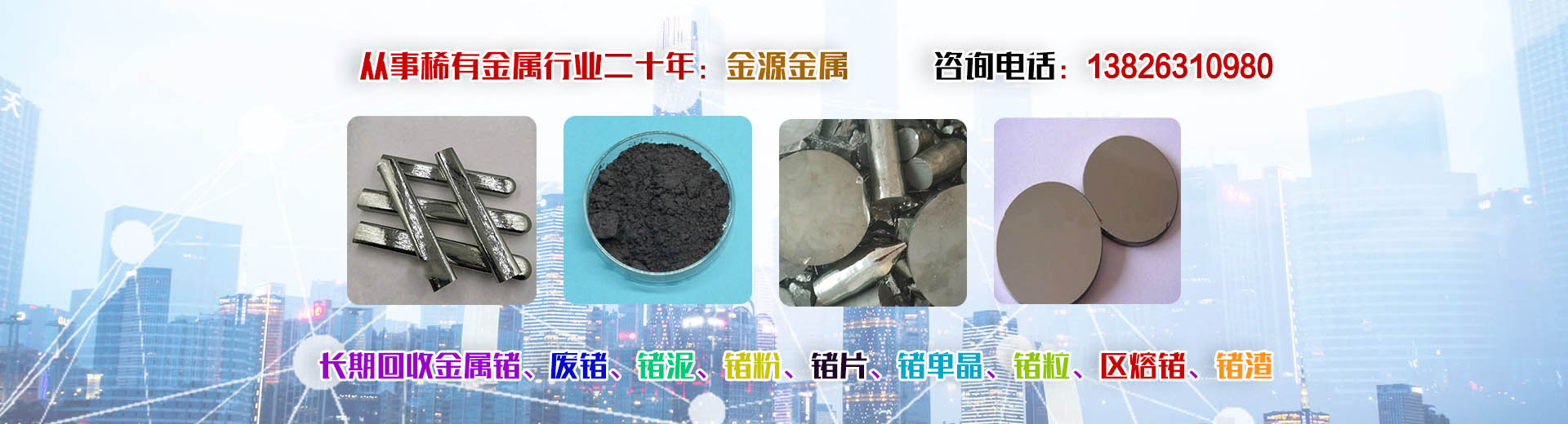 韶關(guān)市金源金屬材料有限公司坐落于中國廣東省韶關(guān)市,長期收購回收銦、精銦、粗銦、銦絲、銦靶材、ITO靶材靶粉、回收金屬鍺、鍺錠、鍺粉、鍺片、回收鍺單晶、單晶鍺、鍺粒、區(qū)熔鍺、工業(yè)鍺、廢鍺、鍺泥、鍺渣、二氧化鍺回收、四氯化鍺、有機(jī)鍺、銀、純銀、銀靶材、高價收購回收ITO廢靶、回收廢銦、廢銦沙、廢銦渣、回收粗銦、廢銦絲、廢銦珠、廢銦箔、廢銦棒、收購銀焊條、銀焊絲、導(dǎo)電銀膠、金屬鎵、硝酸鎵、氧化鎵、三氯化鎵、氯化鎵,供應(yīng)及回收氧化鎵、氫氧化鎵、碲化鎵,硒化鎵,銦粉,氧化銦、氯化銦、硫酸銦、硫化銦、醋酸銦、氫氧化銦、硒化銦,碘化銦,銅銦鎵硒,含金、銀、銦、銠、鈀、鎵、鍺等稀有貴金屬材料,稀土金屬材料、氧化鏑、氧化镥、氧化鋱、氧化鐠釹等回收。